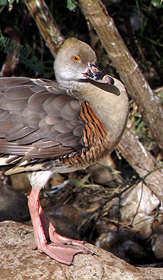 Plumed Whistling-Ducks, Hardheads and an Australasian Grebe in front of the verandah