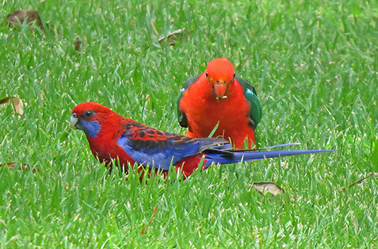 only to find once the binoculars were on them, that they had several diminutive and much less brightly coloured Bluebonnets feeding alongside.