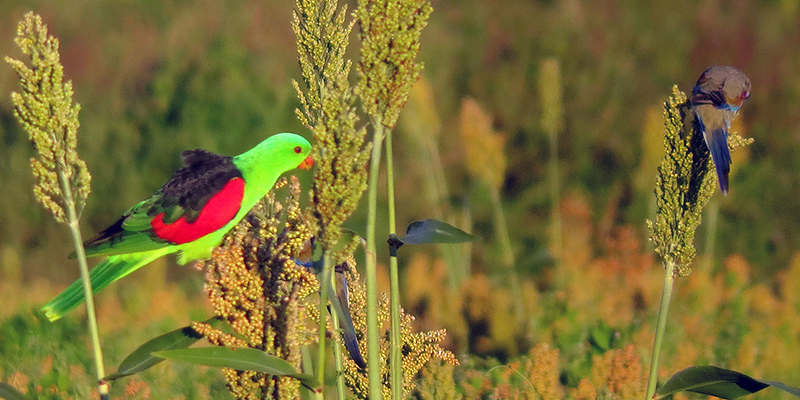 We had another pleasing surprise on the way home, when we stopped to look at some brilliant Red-winged Parrots feasting in a sea of sorghum,