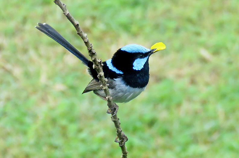 Superb Fairywren - He doesn't have the gaudy colours as the other two spp in the garden, but he is indeed superb. At present, we regularly see male fairywrens carrying petals as part of their display. In my experience, it's always a yellow offering from a male Superb, always a red one from a Red-backed or Variegated.